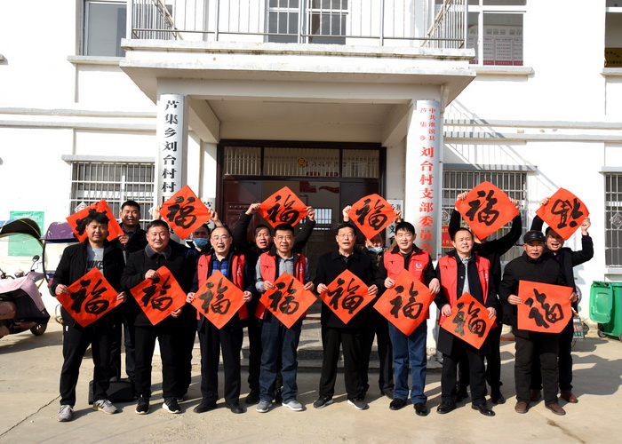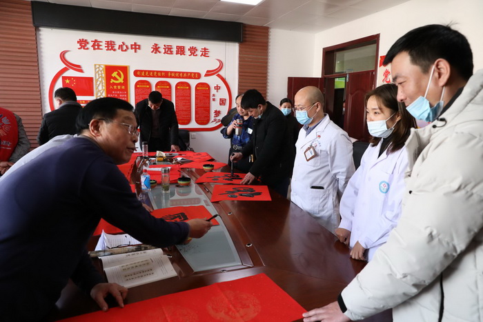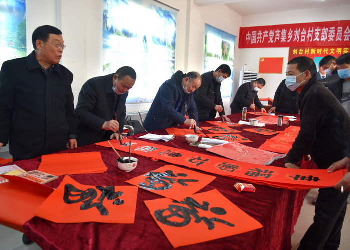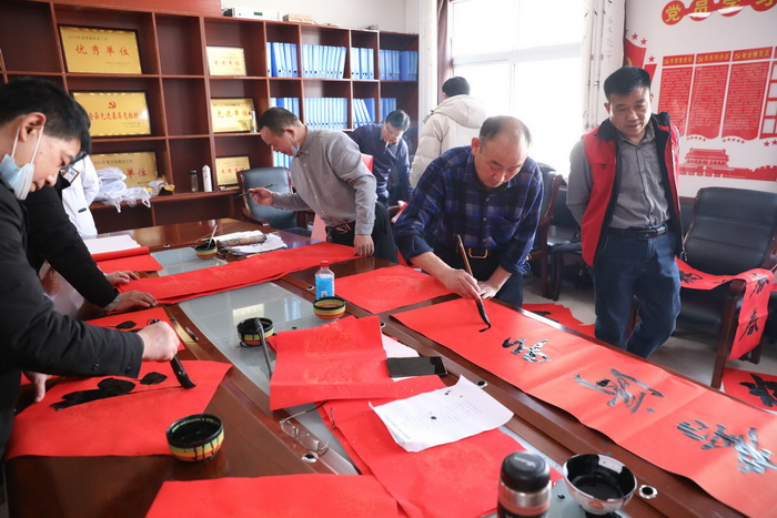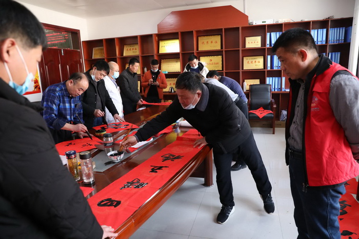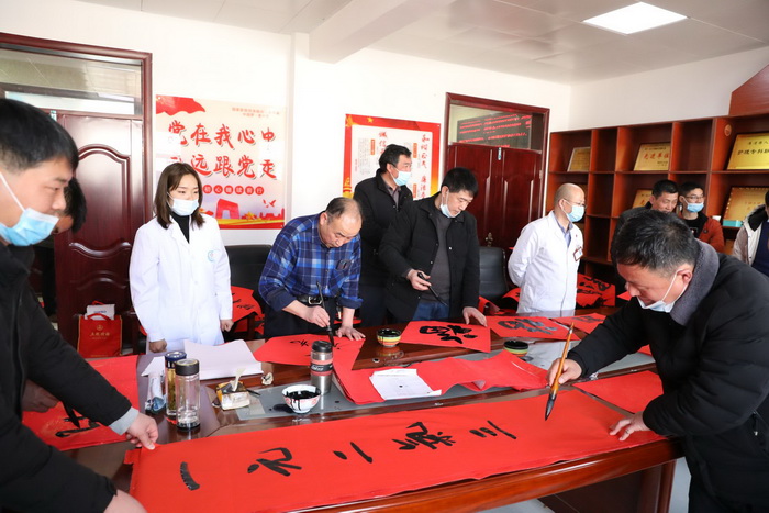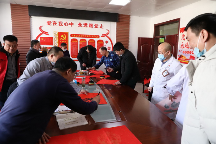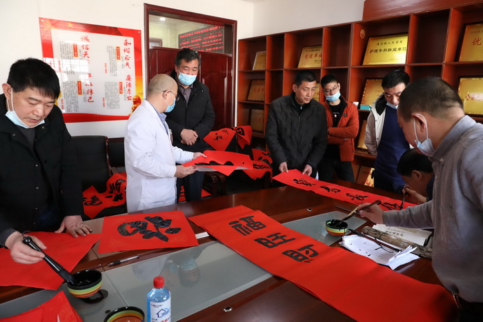 “金牛奔盛世,紫燕舞新春;人逢如意事,牛舞艳阳春;银鼠辞旧岁,金牛迎新春;盛世千家乐,新春百家兴;黄莺鸣翠柳,紫燕剪春风......” 2021年2月7日,河南省淮滨县文联、县书协义写春联活动第二站来到芦集乡刘台村和乡卫生院。上午8时,几名书法家在县文联主席郭文斌的带领下,来到了刘台村,为这里的群众义写春联600余幅,吉祥的春联受到广大村民的欢迎。 随后书法家一行又来到芦集乡卫生院,又为一线医护人员挥毫泼墨,写下上千幅的新春对联。几个小时下来,书法家们共为村民和医护人员写下1600余幅春联。 期间,县文联又组织开展了“话脱贫、感党恩、奋进新时代”系列脱贫攻坚主题创作采风活动。 图为当天书法家挥毫泼墨为村民和医护人员义写春联时的情形。 |