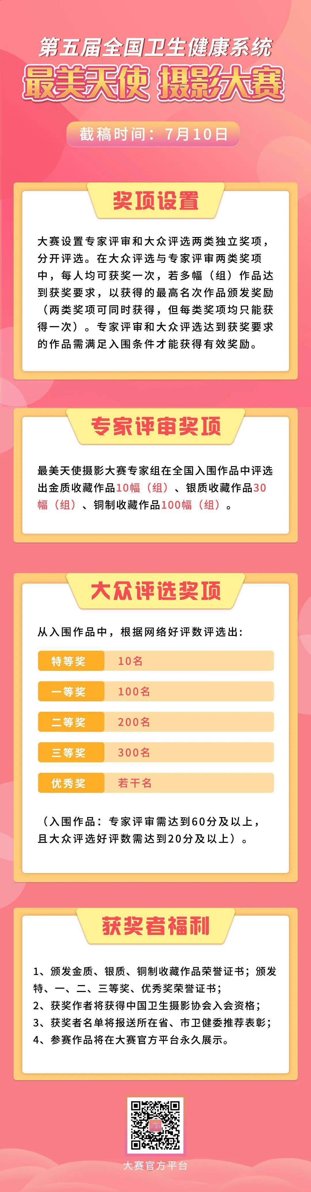 投稿要求 征稿内容 1、疫情防控 2、爱岗敬业 3、和谐医患 4、图文故事(组照) 摄影作品要以5·12国际护士节为契机,多角度、深层次宣传医护工作,确保在疫情防控、治疗成效、呵护患者安全、控制成本效益、维护医疗诚信、改善患者就医感受方面的贡献。通过鲜活的摄影作品维护并树立医护人员的美好形象。 作品要求 1、作品应围绕“最美天使”为主题,类型分为单幅、组照两种。组照应配以较为详细的文字说明,以4-8幅照片为宜。每类型作品投稿上限为5幅(组),上传照片应注明“组照+序列”(详见大赛平台)。 2、投稿者应对其投稿作品拥有独立、完整的著作权。不得侵犯第三人的著作权、肖像权、名誉权、隐私权等在内的任何权利,如有任何相关的法律纠纷,由投稿者本人承担。 3、主办方有权以复制、发行、展览、放映、互联网传播等方式将所有参赛作品用于出版图书、画册及推荐相关媒体发表,并在其广告、宣传、展览及文化等活动中宣传展示,不另付稿酬。 4、参展作品不收任何费用,不退稿。主办方拥有本次大赛活动的最终解释权。凡投稿的作者,均视为同意并遵守本次大赛各项规定。 如何投稿? 补充要求 1、作品可以个人或者单位的名义进行投稿。 2、作品一律以电子文件形式提交,提交的摄影作品为JPG或PNG格式,每个图片文件要求小于4M(获奖后提供原图)。 3、扫描附件1上的二维码,关注大赛官方平台“健康榜” (微信号jkbjkb168),进入公众号点击底部按钮“最美天使大赛”登陆“第五届全国卫生健康系统‘最美天使’摄影大赛”平台进行投稿。 4、按照要求填写作品信息,上传作品完成投稿。(参赛者请填写真实准确的个人信息,如因错误填写个人信息,造成获奖证书发放错误的,后果由参赛者自行承担。) 除了个人有机会拿大奖外, 如果您是单位公众号的小编, 还有机会为单位争取到国家荣誉哦! 利用 单位或者个人的微信公众号 推送了有关本次大赛征稿信息 就可成为本次大赛的官方支持媒体! 带走金灿灿的国家荣誉