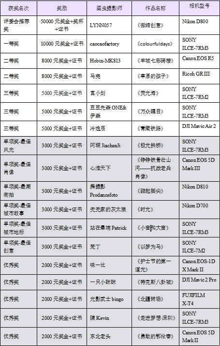 本届京东摄影金像奖征稿历时31天,收到6万余位图虫专业摄影师/摄影爱好者投稿共计24.4万余幅作品。本次大赛相机赛区投稿最为火爆,共收到18.5万余幅作品。为了鼓励年轻影像创作者,今年特别开设校园赛道,也涌现了非常多年轻影像创作者,共收到4.8万余幅作品。短视频赛区共收到9千余支短视频作品。大赛评选工作10月25日开始,从内容创新、视觉表现、技巧创意、主题切合、内容深度等方面进行评选,经过图虫专业影像编辑初选,评委团初审,影像行业助力官评审,评审团线上集中复审,最终遴选出51幅/组获奖作品,50位图虫摄影师,共同分享34万现金大奖! 感谢所有参赛摄影师对第五届京东摄影金像奖一如既往的支持,每个日常拍不寻常,我们邀您在赛后也继续关注生活,记录美好!最后,让我们一起揭晓50位获奖摄影师的精彩作品吧!其中部分数量较多的组图作品仅显示单幅,更多作品请进入摄影师主页查看哦! 获奖作品名录 1/ 相机赛区(共18位获奖者) 评委会推荐奖 1名 奖励:50000元奖金+奖杯+证书 作者:LYNN057 《微缩创意》 拍摄设备:Nikon D800 评委推荐评语: 汤辉:微缩摄影的技术层面早已没有瓶颈,尤其气氛夸张的表达方式比比皆是,但这组作品的创意来自于生活的方方面面,灵巧而朴实。 王景春:也許来自于疯狂美食的奇思妙想,颠覆现实景观的系列创意是这组影像脱颖而出。 李政霖:创意源于生活而取之于生活,无论是西天取经的经典回顾,还是遨游天际的太空畅想,色彩、妙趣、灵动结合,让这一切在新的小天地中焕然重生。 林海音:凝聚了摄影师的灵感,创意,耐心,细心的一系列作品。也希望今后能看到越来越多的优秀微缩创意作品。 Thomas:微缩置景作品,摄影师的脑洞永远是第一位的。摄影师所拍摄的很多场景,不仅仅是对现实的再现,更是一种别样的重构。当我们生活中的面包变成了小人国里的巨山,摄影师的创意让人惊叹。 一等奖 1名 奖励:10000元奖金+证书 图虫摄影师:caocaofactory 《colourfuldays》 拍摄设备:SONY ILCE-7RM3 二等奖 2名 奖励:8000元奖金+证书 图虫摄影师: Hobin-MK813 《羊城七彩骑楼》 拍摄设备:Canon EOS R5 图虫摄影师:马尧 《草原的孩子》 拍摄设备:Ricoh GR III 三等奖 3名 奖励:5000元奖金+证书 图虫摄影师:宫小剑 《荧光海》 拍摄设备:SONY ILCE-7RM2 图虫摄影师:豆豆先森ONE&伊森 《万众瞩目》 拍摄设备:SONY ILCE-7RM3 图虫摄影师:冷逸辰 《青藏铁路》 拍摄设备:DJI Mavic Air 2 完整奖项名单 2/ 短视频赛区(共17位获奖者) 评委会推荐奖 1名 奖励:50000元奖金+奖杯+证书 图虫摄影师:孙思远 《再见大同》 视频链接: https://webmaster.tuchong.com/video/9519022/detail 评委推荐评语: 汤辉:个人视角的城市"形象片",摆脱了千篇一律的叙事方式,有情感、接地气。 李政霖:作者运用流畅而娴熟的转场和剪辑手法,将对这片土地的热爱融入每一个镜头中。宁静与狂欢并存,古老与现代碰撞,这永不停歇的活力,也让我们看到了一个全新的城市生命力。 付增凯:一个优秀的视频作品不在于作者对于视觉语言的娴熟驾驭,不在于镜头设计的巧妙华丽,而是将自己的真实情感融于作品之中。作者用短促且有力的画面,将四年大同生活的记忆片段谱写成了铿锵有力的乐章。观众跟随着画面的节奏又再一次穿越了大同的大街小巷,飞过了山川河流,人们看到的不仅仅是作者在这座城市留下的印记,更看到了作者对这个生活了四年城市满满的热爱。再见大同,依旧熟悉和美好。 林海音:技术精湛的一条短片。 Thomas:什么样的视频能够让人印象深刻?流畅的运镜、恰到好处的音乐、不错的故事线、酷炫的特效,其中有一两条便是优质作品了,而本条视频兼具了以上优点,让人过目不忘。 一等奖 1名 奖励:10000元奖金+证书 图虫摄影师:追梦人的梦 《我们的北京》 视频链接: https://webmaster.tuchong.com/video/9485431/detail 二等奖 2名 奖励:8000元奖金+证书 图虫摄影师:漫阿野&阿米Amir 《动静桂林》 视频链接: https://webmaster.tuchong.com/video/9531639/detail 图虫摄影师:Just_Fell_Asleep 《MOUNTAINS》 视频链接: https://webmaster.tuchong.com/video/9533799/detail 三等奖 3名 奖励:5000元奖金+证书 图虫摄影师:SUMMER梅子青时节 《最美的乡愁记忆》 视频链接: https://webmaster.tuchong.com/video/9418177/detail 图虫摄影师:Spider Xu 《STARTS IN THE DESERT》 视频链接: https://webmaster.tuchong.com/video/9432735/detail 图虫摄影师:青锋Fing 《南京风月四时》 视频链接: https://webmaster.tuchong.com/video/9515449/detail 完整奖项名单 3/ 校园赛区(共16位获奖者) 评委会推荐奖 1名 奖励:50000元奖金+奖杯+证书 图虫摄影师: YUJIEXU 《我的一家人》 校园信息:中央美术学院 评委推荐评语: 汤辉:我喜欢的不仅是影像本身,而是其背后的思考,事关人性与社会层面的种种...... 王景春:从"情感、文化、欲望、自我"四个关键词用影像去映射当下社会的现状是一个挑战,而这四个关键词的提炼与描述更需要一个理论支撑,如同电影《七宗罪》来源于天主的教义;当然,我喜欢这组片子是作者有思考,影像诠释的比较到位。 付增凯:这组作品将家庭成员的形象抽象成一个个具有象征意义的符号,不仅为画面增加了一丝趣味性,更重要的是作者利用不同的人物形象展现出了家庭中每个人的地位与关系。在作者构建的情节中,观众可以看到家庭生活中的细碎与平常,也能够看到不同时代人群的特征与属性。作者利用一种