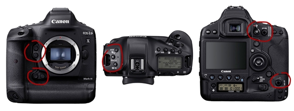 EOS-1DX Mark III经典的佳能专业机操控,特点是正面更多的自定义键、左肩的双功能组合键、背面的拍照/视频切换扳把、光电鼠标AF-ON键。