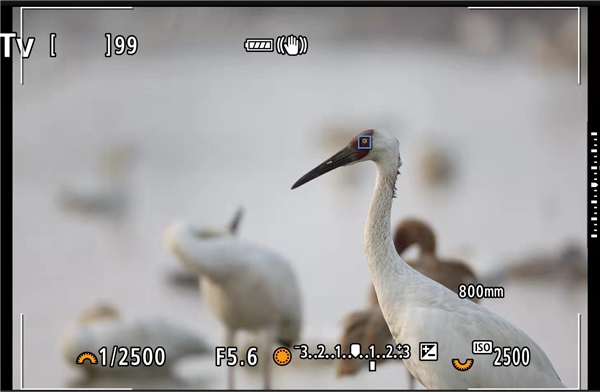 白鹤,EOS R3, F5.6, 1/2500s, ISO 4000, 眼控对焦示意,黄圈会跟着我们的眼神在取景框里游走。 于是,EOS R3有了一个堪称完美的解决方案——眼控对焦,对,就是佳能胶片机上那种眼控对焦。开启眼控后,取景框里会出现一个黄圈,它就是眼睛的焦点,你看哪,黄圈就跟着去哪对焦,用眼神就能选择主体,没有什么比它更省事了。需要注意的是,一次检测不足以让黄圈特别“跟眼睛”,需要在正常亮度、高亮度(对着太阳对着灯)、低亮度(盖上镜头盖)的环境下做多次校准,然后这个黄圈就是特别“跟眼睛”了。