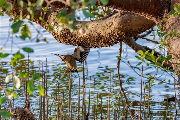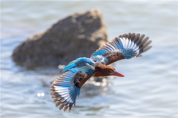 白胸翡翠,EOS R3, F7.1, 1/4000s, ISO 2500。对焦设置:追踪灵敏度-低、加速/减速追踪-高、切换被追踪被摄体-初始优先。 这只白胸翡翠本来站在石头上,一直按下AF-ON键,让对焦系统一直工作并锁定在它身上,起飞后跟随拍摄,考验相机对突然起飞的鸟的追踪能力。