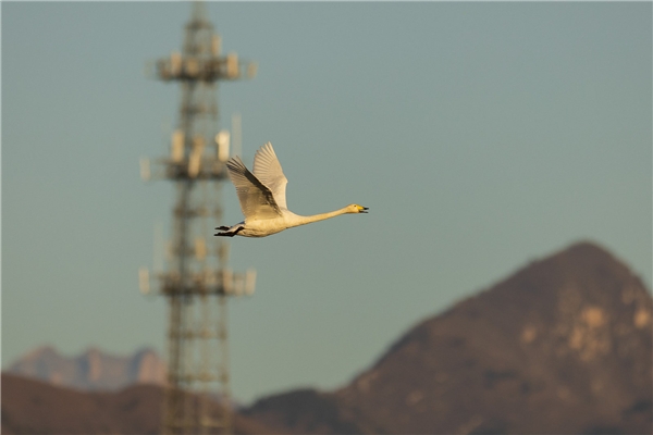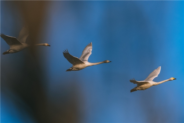 大天鹅,EOS R3, F3.2, 1/4000s, ISO 320。对焦设置:追踪灵敏度-低、加速/减速追踪-低、切换被追踪被摄体-初始优先。 在取景框中跟随一群天鹅,它们很少在飞行中变速,所以用低灵敏度的设置获得稳定的追焦,忽略掉跟随中遇到的障碍物,譬如前景的树枝,尽管此时它比鸟更容易合焦,相机在低灵敏度下仍然会忽略它们。