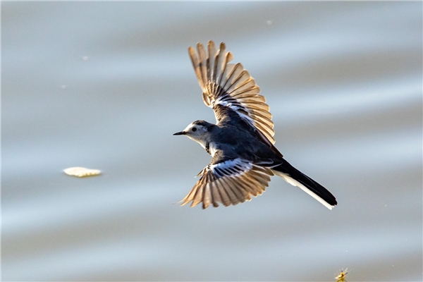 白鹡鸰,EOS R3, F8, 1/3200s, ISO 1250。对焦设置:追踪灵敏度-高、加速/减速追踪-高、切换被追踪被摄体-尽量追踪被摄体。 搜索单一一只不在取景框里的鸟,譬如这只正在飞的白鹡鸰。关闭眼控,使用全屏对焦,高追踪灵敏度让相机迅速捕捉突然入框的鸟,然后跟随拍摄。