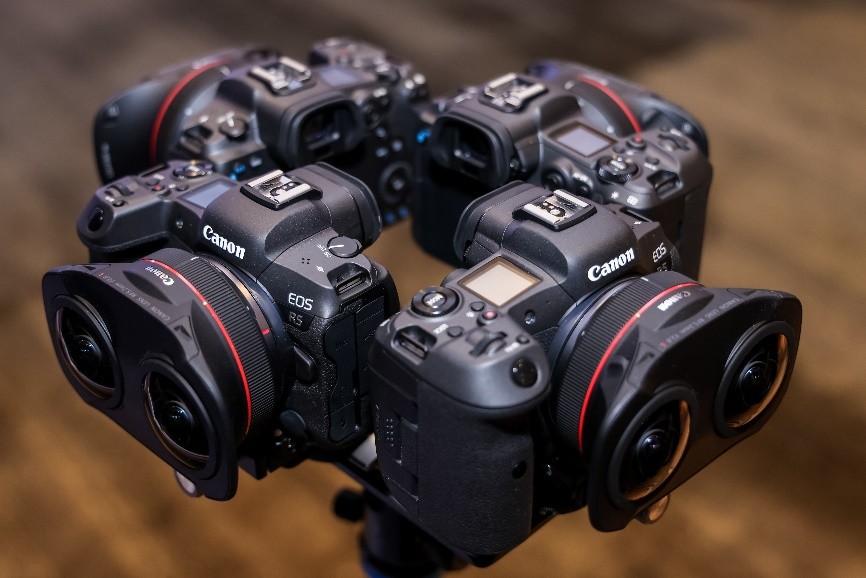 8K 3D 180°VR拍摄解决方案 佳能EOS VR系统第二次亮相VR生态大会,仍然吸引了众多与会者的驻足。EOS VR系统是首个可更换镜头的3D 180°VR拍摄方案,只需一台相机+一支VR镜头即可完成拍摄。基于搭载的两个镜头的视差,直接拍摄3D立体画面,与传统视频相比更具临场感。因为其视野是360°VR视频的一半,容易实现高画质,影像细节部分也清晰可见,立体感十足。拍摄者可以持机拍摄,从而更灵活的布光,画面还不容易穿帮。在XR &元宇宙沉浸体验区,VR从业者、爱好者争相上手3D 180°VR拍摄方案,感受其新奇的乐趣和魅力。 在XR产业迎来新的发展阶段之时,佳能进一步开拓全方位多场景的VR市场,正式展出了3D 360°VR 拍摄解决方案。该方案由4个EOS R5/R5C机身和VR双鱼眼镜头套件组合而成,支持拍摄360° 全景VR视频,吸引了众多从业者的关注与交流。