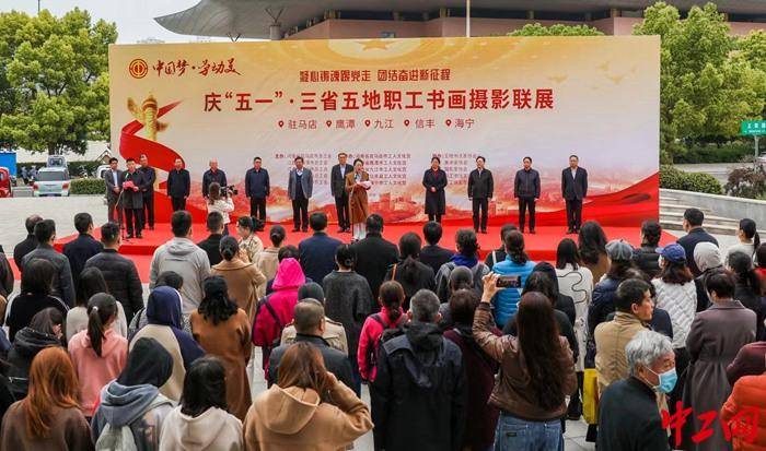 三省五地职工书画摄影联展在驻马店市工人文化宫开幕 中工网讯 4月22日,由江西省鹰潭市、九江市、信丰市,浙江省海宁市,河南省驻马店市三省五地总工会、工人文化宫共同举办的“中国梦·劳动美”——庆“五一”·三省五地职工书画摄影联展在驻马店市工人文化宫隆重开幕。