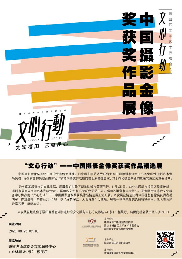 “文心行动”——中国摄影金像奖获奖作品精选展 中国摄影金像奖是经中共中央宣传部批准、由中国文学艺术界联合会和中国摄影家协会主办的全国性摄影艺术最高奖项,旨在表彰和奖励在摄影创作领域取得优异成绩的德艺双馨摄影家,对于推动摄影事业的繁荣发展起到重要作用。 为丰富基层群众的文化生活,用摄影的力量不断推进城市美丽前行,8月25日,由中共深圳市福田区委宣传部、深圳市福田区文学艺术界联合会 、福田区文艺家协会联合党委主办,福田区摄影家协会承办、香蜜湖街道综合文化服务中心协办的“文心行动”——中国摄影金像奖获奖作品精选展正式开展。本次展览精选获得中国摄影金像奖获得者岳鸿军、陈茂盛等人的作品共40幅,以“逐梦深蓝、大地诗意”为主题,展现一幅幅美轮美奂的精彩画面,让人看后如身临其境,流连忘返。 本次展览地点位于福田区香蜜湖街道综合文化服务中心(农林路24号)1楼展厅,将面向社会展出至9月10日,欢迎广大市民及摄影爱好者前往参观。 展期:8月25日-9月10日 ——展厅现场展示作品—— |