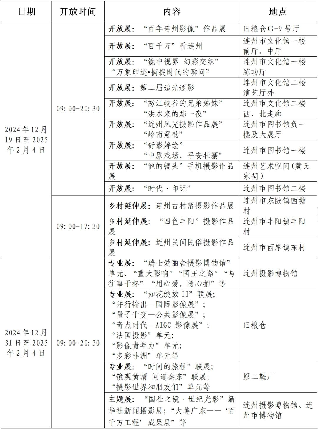 为给全球摄影艺术家、广大游客和市民朋友带来独特的“摄影+非遗”文化体验,实现以文塑旅、以旅彰文,推动百亿级文旅产业高质量发展,经2024连州国际摄影年展组委会研究,年展主题晚会定于2024年12月31日晚上7:45在连州市刘禹锡文化广场举行。 一、各场馆开放时间 01 开放展 设在连州市文化馆、连州市图书馆、连州市博物馆、连州艺术空间(黄氏宗祠)、旧粮仓(G-9)厅 展期:2024年12月19日至2025年2月4日 开放参观时间:每天上午9:00至晚上8:30 02 乡村延伸展 设在东陂镇西塘村、丰阳镇丰阳村、西岸镇东村 展期:2024年12月19日至2025年2月4日 开放参观时间:每天上午9:00至下午5:30 03 专业展 设在连州摄影博物馆、旧粮仓和原二鞋厂 展期:2024年12月31日至2025年2月4日 开放参观时间:每天上午9:00至晚上8:30 详情见下表 备注:具体活动日程可能会有微调整,请以活动当天通知为准。 二、活动安排 (一)主题晚会 时间:2024年12月31日晚上7:45-9:00 地点:连州市刘禹锡文化广场 (二)艺术品商店、网红打卡:分别设在连州摄影博物馆、连州第一大道旅游商业街B区二层等地。 (三)艺术交流地点与时间: 备注:具体活动日程可能会有微调整,请以活动当天通知为准。 清远发布编辑部 |