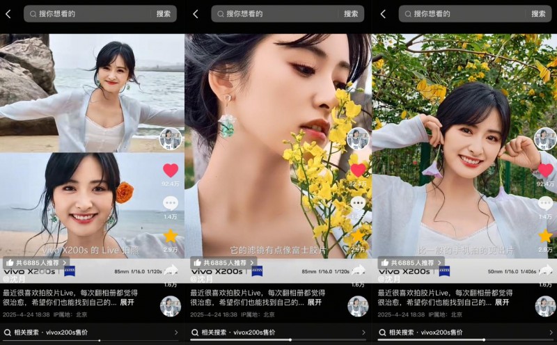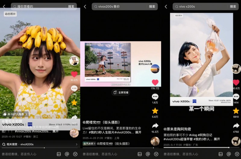 与此同时,抖音平台通过搭建达人矩阵——头部摄影师建立专业信任,新锐创作者定义年轻美学,素人达人激发情感共鸣,进一步为话题破圈传播打开声量。邀请雪松在拍照、爬楼党(街头摄影)、原来是陶阿狗君、叶巨、李默等13位不同风格的优质达人组成 “美学传播联盟”,以多元内容渗透不同用户圈层。 技术流达人深化专业认知,擅长胶片摄影的 @雪松在拍照 发布《想跟沈月拍同款胶片live》,详细拆解vivo X200s特有的负片滤镜如何模拟胶卷的色彩感,结合“春日限定构图”模式在公园的Live实况实拍演示,单条视频点赞量达10万,评论区被 “原来手机也能拍出胶片感”“被胶片Live人像功能种草” 等留言刷屏。 在摄影师 @爬楼党(街头摄影) 发布作品《Live留住的不仅是瞬间,更是那蓬勃的生命力》中,他使用vivo X200s的胶片Live人像功能,在街头捕捉路人奔跑、大笑、相聚等充满生命力的瞬间,其富士胶片感的低饱和色调、“比照片多3秒生命力”的动态记录能力,把瞬间清晰定格在手机镜头当中。并通过跨生态也能“一碰传”的功能,将Live传递给被拍摄者,将生活中的珍贵瞬间真正凝固成永恒不褪色的生命力印记。 @原来是陶阿狗君 在《要拍照的事可不少》vlog中,使用vivo X200s在白云山草坪和动物园拍摄动态Live图,借助人像模式下的运动人像算法清晰定格了抓拍跑跳等大动作,叠加负片风格呈现出的富士胶片质感,展现晴天、雨天等不同场景下的记录价值,展示出Live图通过光影声音封存生命力、记录珍贵瞬间的出色表现。