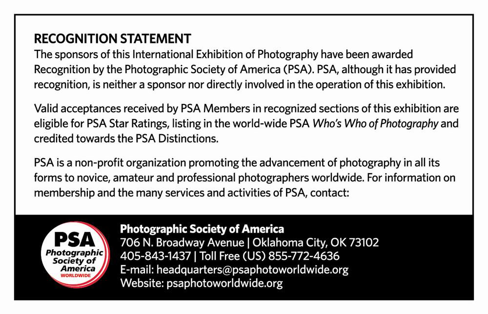 8th ZHUHAI INTERNATIONAL EXHIBITION OF PHOTOGRAPHY (2025) is conducted under the approved rules of the Photographic Society of America (PSA) 025-2054,the International Federation of Photographic Art (FIAP) 2025/566, EFA 2025,PSSM,CPNO. Acceptances in A and B sections obtained in this salon will be taken into account for PSA Star Rating listings in the worldwide PSA Who’s Who of Photography and credited for PSA Distinctions.